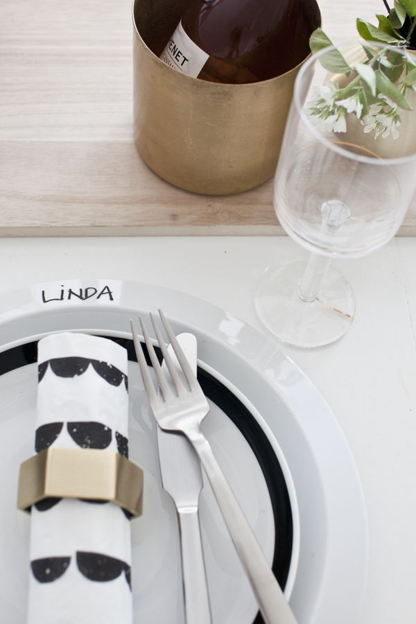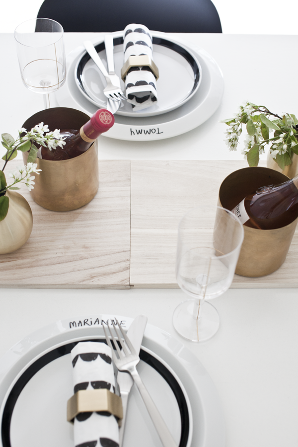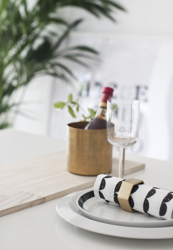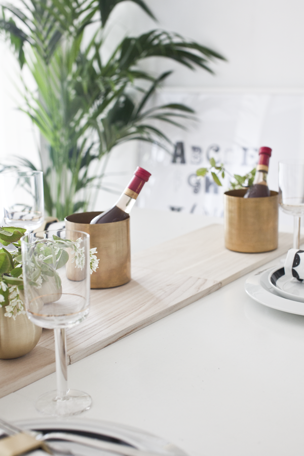 Et lite glass er nok og jeg bruker messingpotter som vinkjøler, én til hver gjest. Vinglasset er fra Hay, elsker gulldetaljene. I stedet for duk har jeg valgt å bruke en rekke med skjærebrett som jeg pynter med små messingvaser og blomster fra hagen. Tallerkenen er fra Kähler, bestikket er fra Kay Bojesen. Servietter og serviettringer er fra Ferm Living.